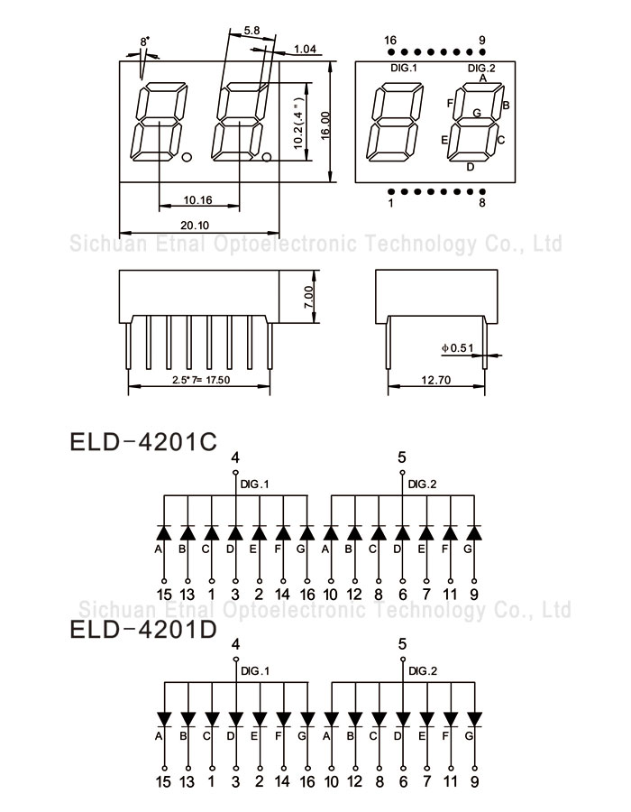 | ELD-4201DS | 0.4" 英寸 | 2位數(shù)碼管 | 共陽(yáng) | 紅色 | 5-20 | 1.8-2.0 | 620-640 |