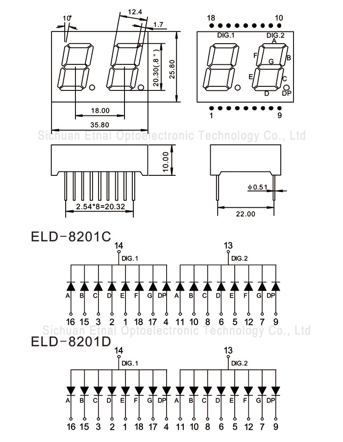 ELD-8201DS 0.8" 英寸 2位數(shù)碼管 共陽 紅色 5-20 1.8-2.0 620-640