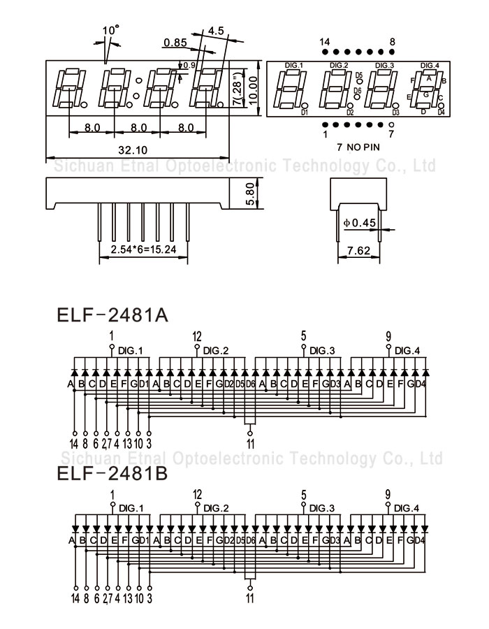 | ELF-2481AG | 0.28" 英寸 | 4位數(shù)碼管 | 共陰 | 黃綠 | 5-20 | 1.8-2.0 | 565-575 |