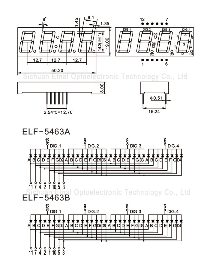 | ELF-5463AG | 0.56" 英寸 | 4位數(shù)碼管 | 共陰 | 黃綠 | 5-20 | 1.8-2.0 | 565-575 |