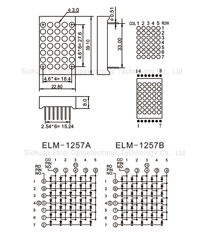 | ELM-1257AS | 1.2" 英寸 | 3mm | 5X7 | 點陣管 | 共陰 | 紅色 | 5-20 | 1.8-2.0 | 620-640 |