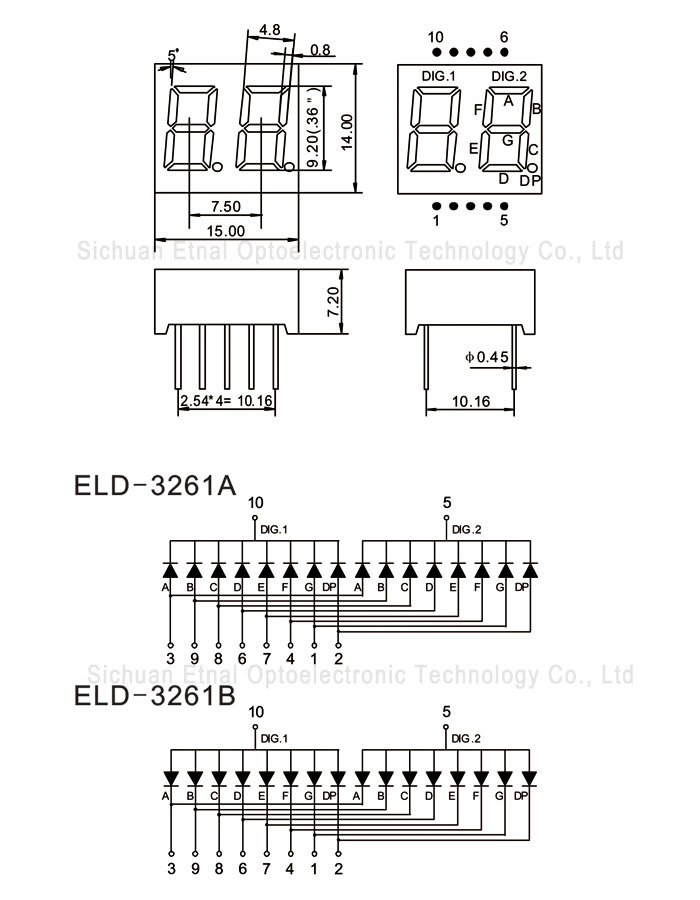 | ELD-3261BW | 0.36" inch | Dual digit led display | Common Anode | White | 10-20 | 2.6-2.8 | / |