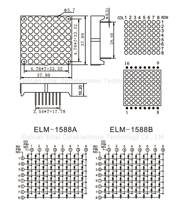| ELM-1588AS | 1.5" inch | 3.7mm | 8X8 | Dot Matrix led display | Common Cathode | Red | 5-20 | 1.8-2.0 | 620-640 |