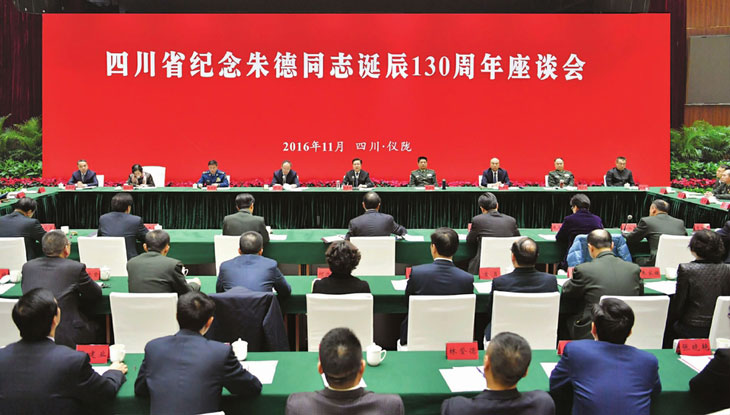 省委書記王東明,西部戰(zhàn)區(qū)司令員趙宗岐,西部戰(zhàn)區(qū)副司令員兼戰(zhàn)區(qū)空軍司令員戰(zhàn)厚順,成都軍區(qū)善后辦主任周小周,朱德同志親屬代表和各界群眾代表出席紀(jì)念活動。省委副書記、省長尹力,省委副書記劉國中分別主持座談會和敬獻(xiàn)花籃儀式。 |